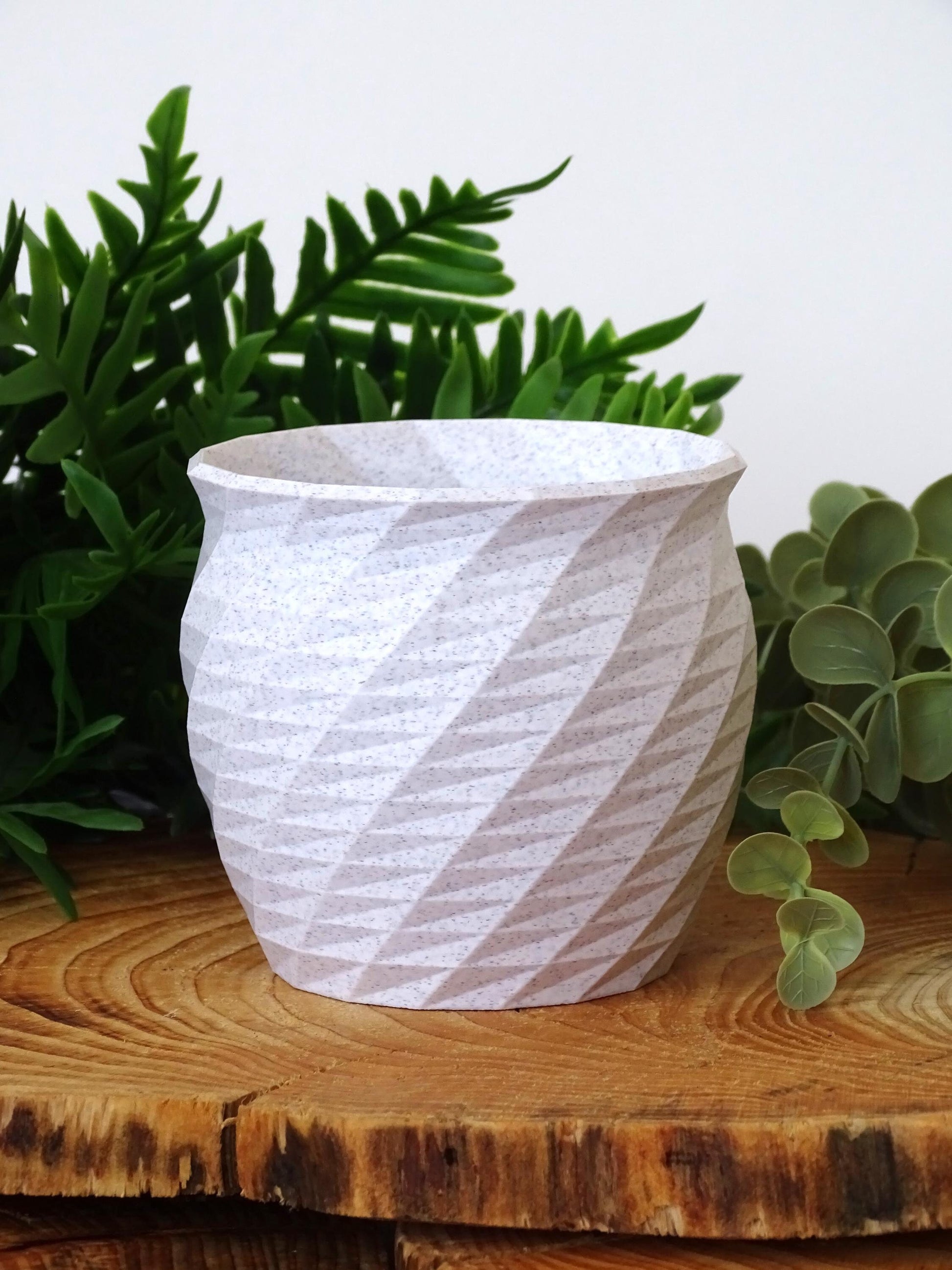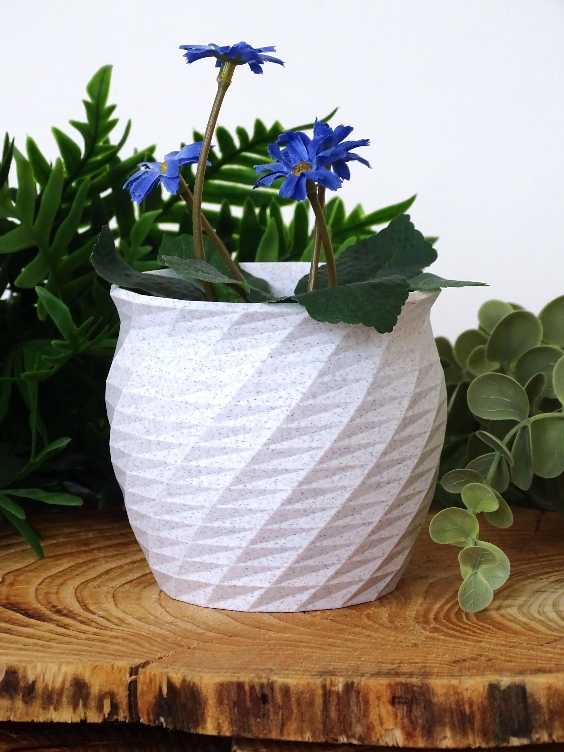 The Spiral Ribbed Planter pictured is printed in White Marble.